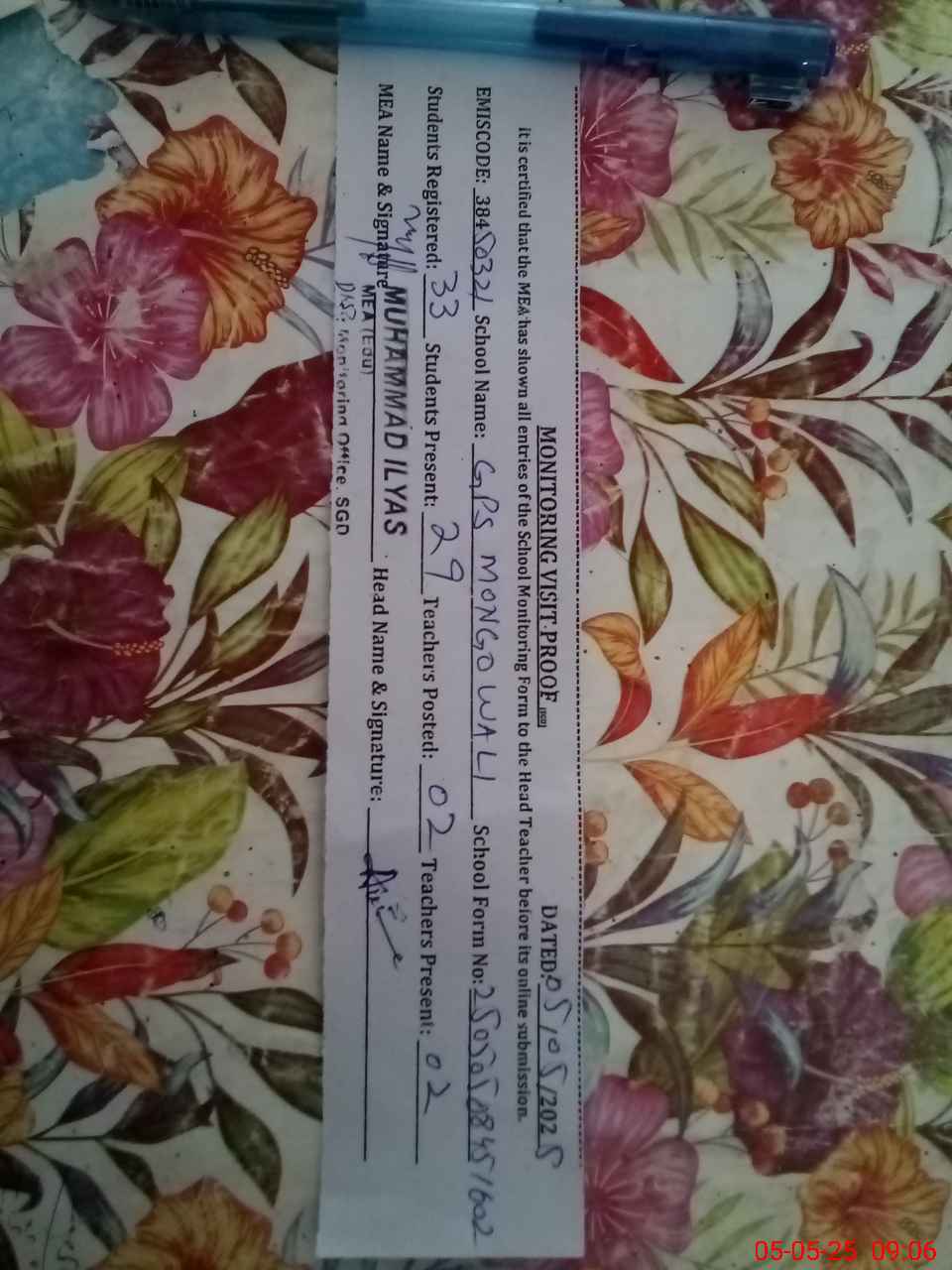 | Certified that this School was Inspected by the Undersigned MEA/DMO Today and the Information Stated Above is as Per Record. | |||||