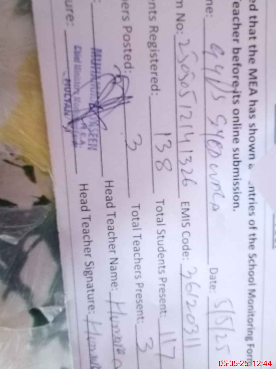 | Certified that this School was Inspected by the Undersigned MEA/DMO Today and the Information Stated Above is as Per Record. | |||||