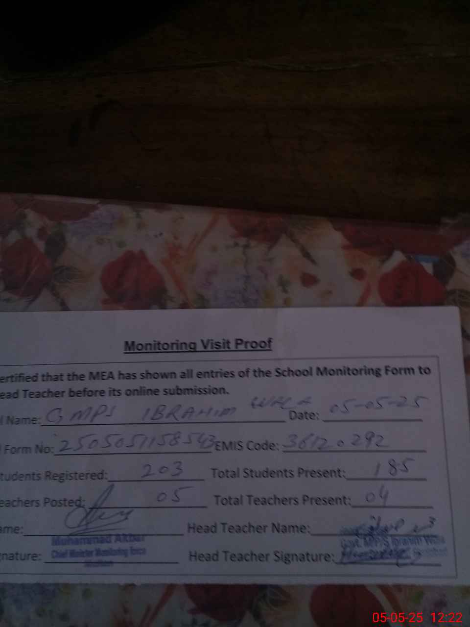 | EMIS Code: 36120292 | Name of School: GMPS IBRAHIM WALA SHUJABAD | |||