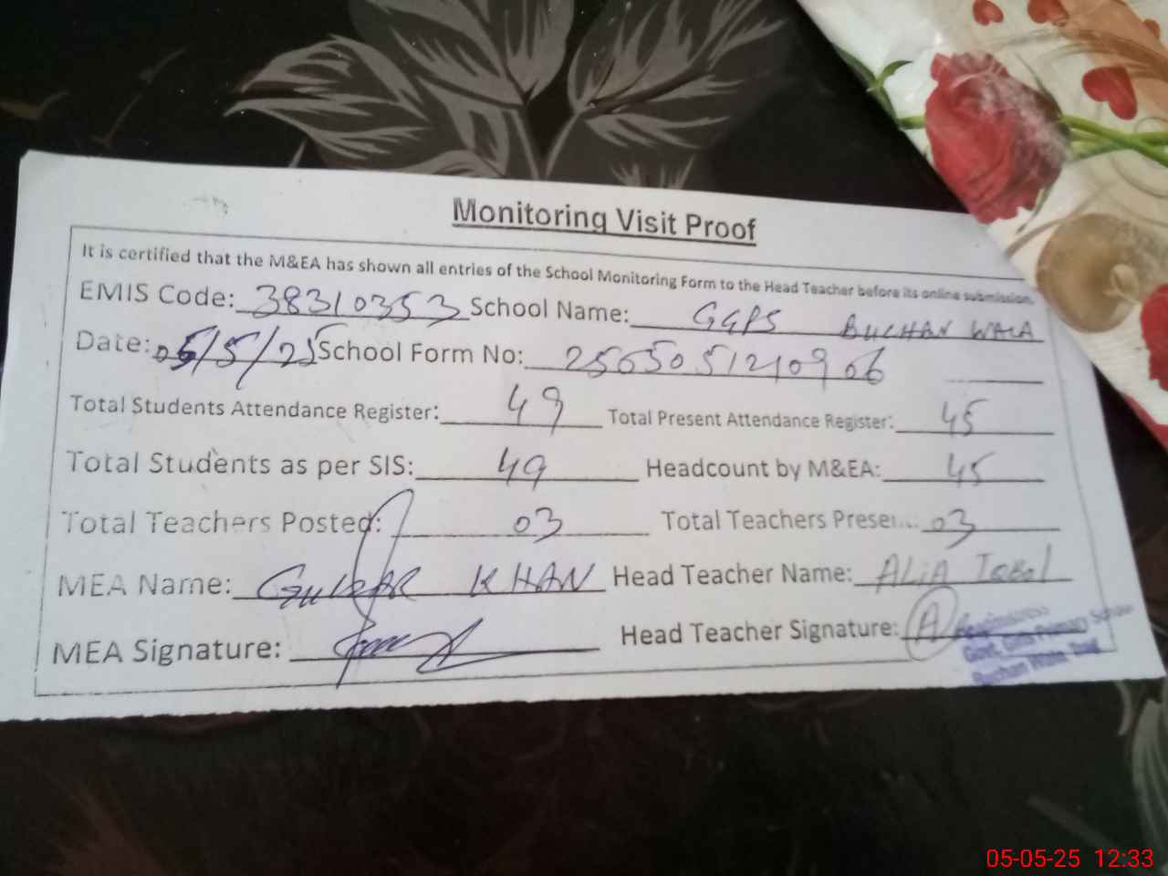 | Attendance Register | Head Teacher | MEA with School | Visit Proof |