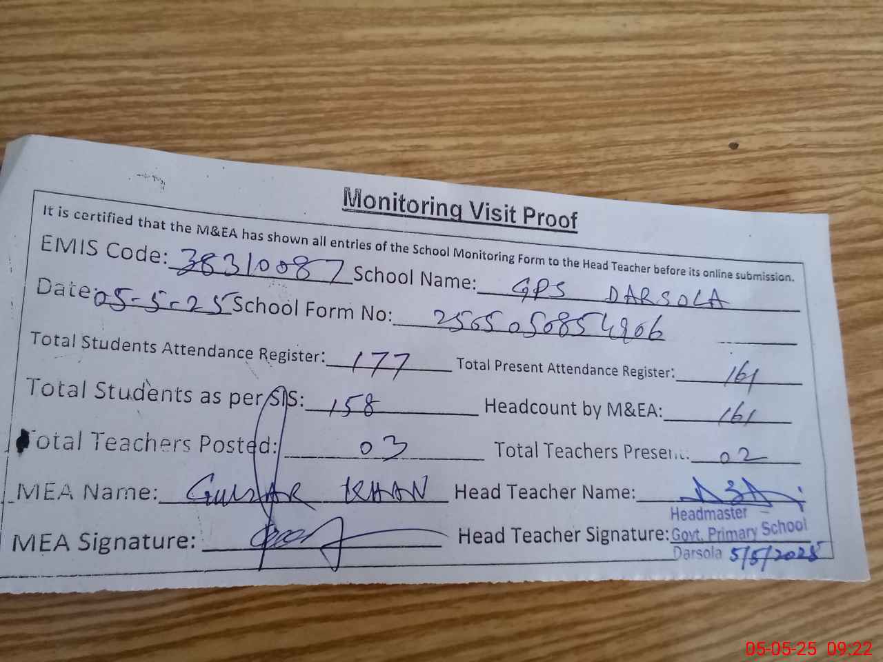 | Attendance Register | Head Teacher | MEA with School | Visit Proof |