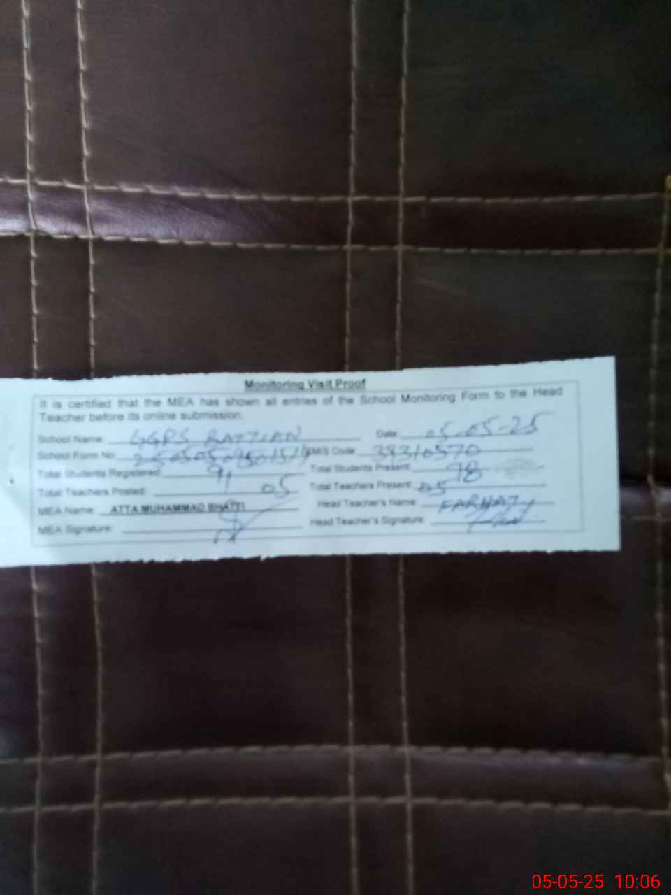 | Attendance Register | Head Teacher | MEA with School | Visit Proof |
