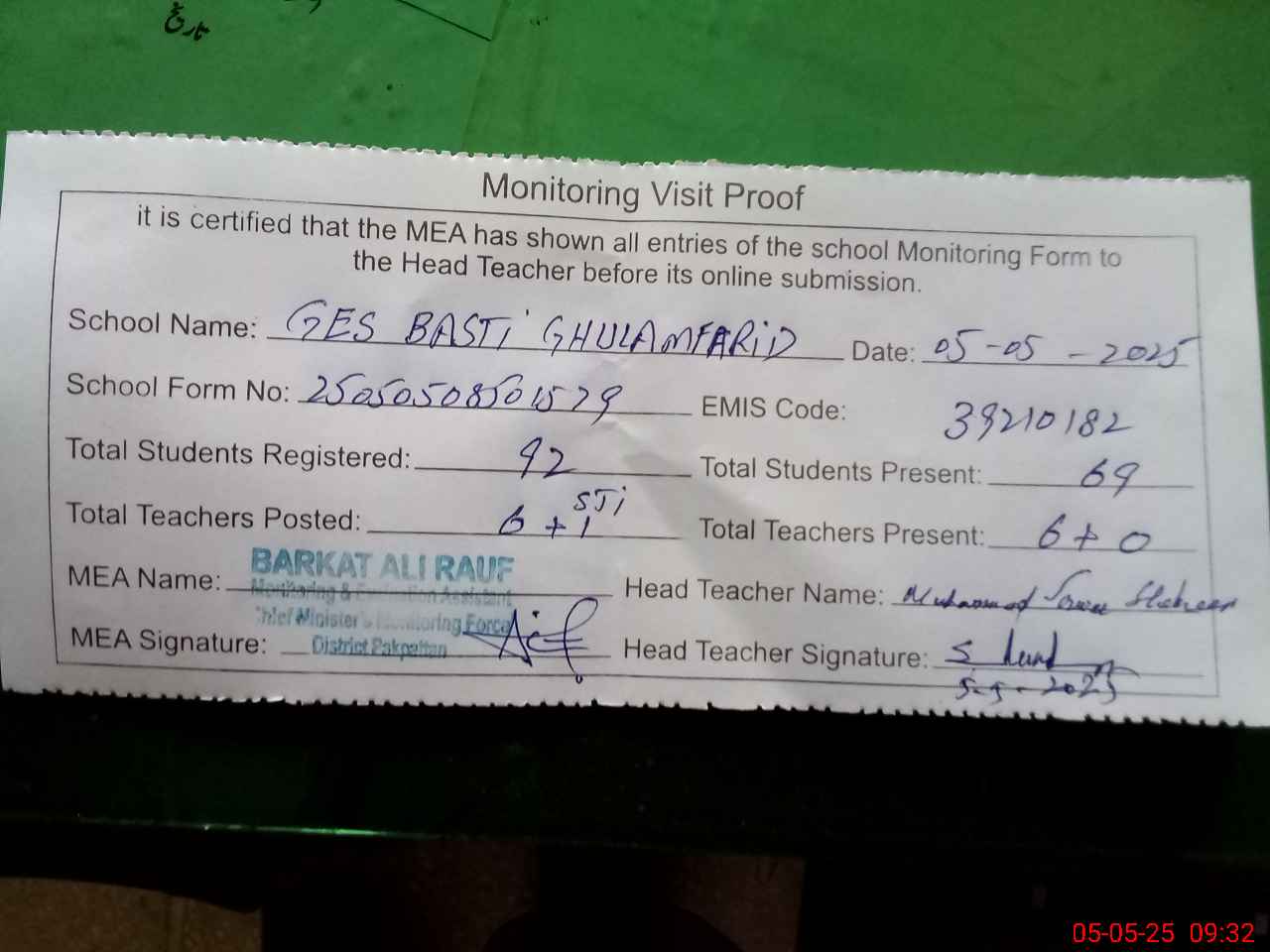 | EMIS Code: 39210182 | Name of School: GES BASTI GHULAM FARID | |||