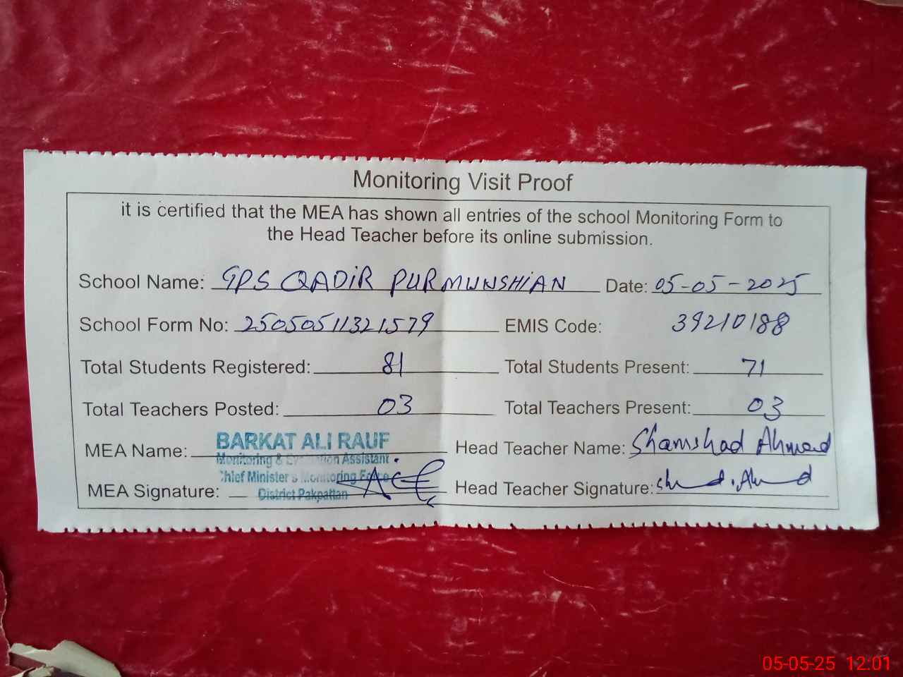 | Attendance Register | Head Teacher | MEA with School | Visit Proof |