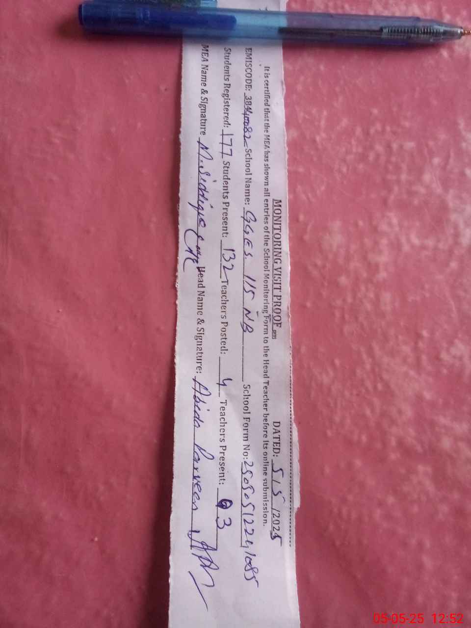 | Attendance Register | Head Teacher | MEA with School | Visit Proof |