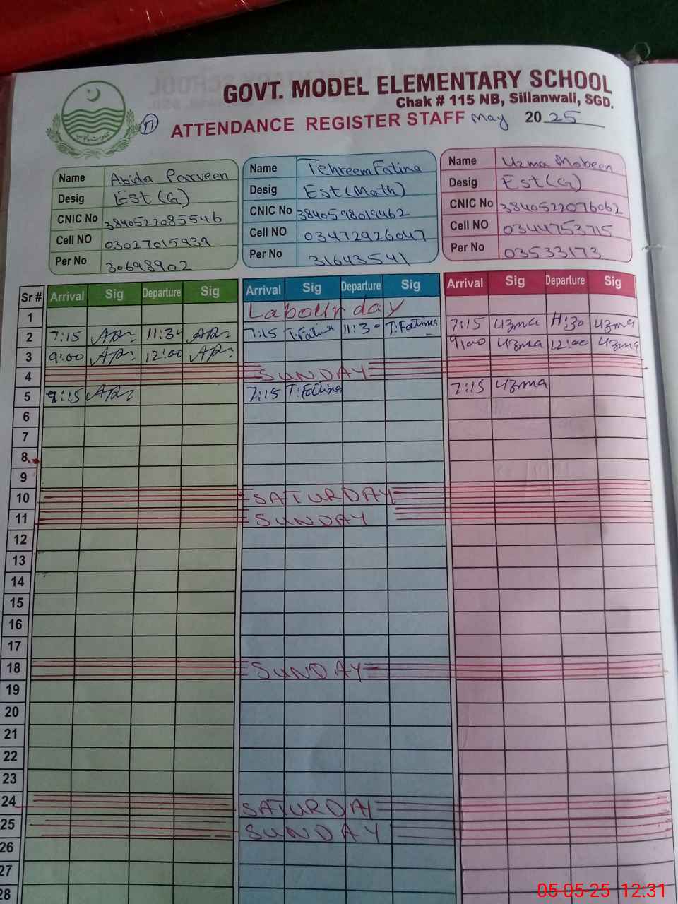 | CNIC | Full Name | Designation | R/C | Absence During Last Calender Month |
