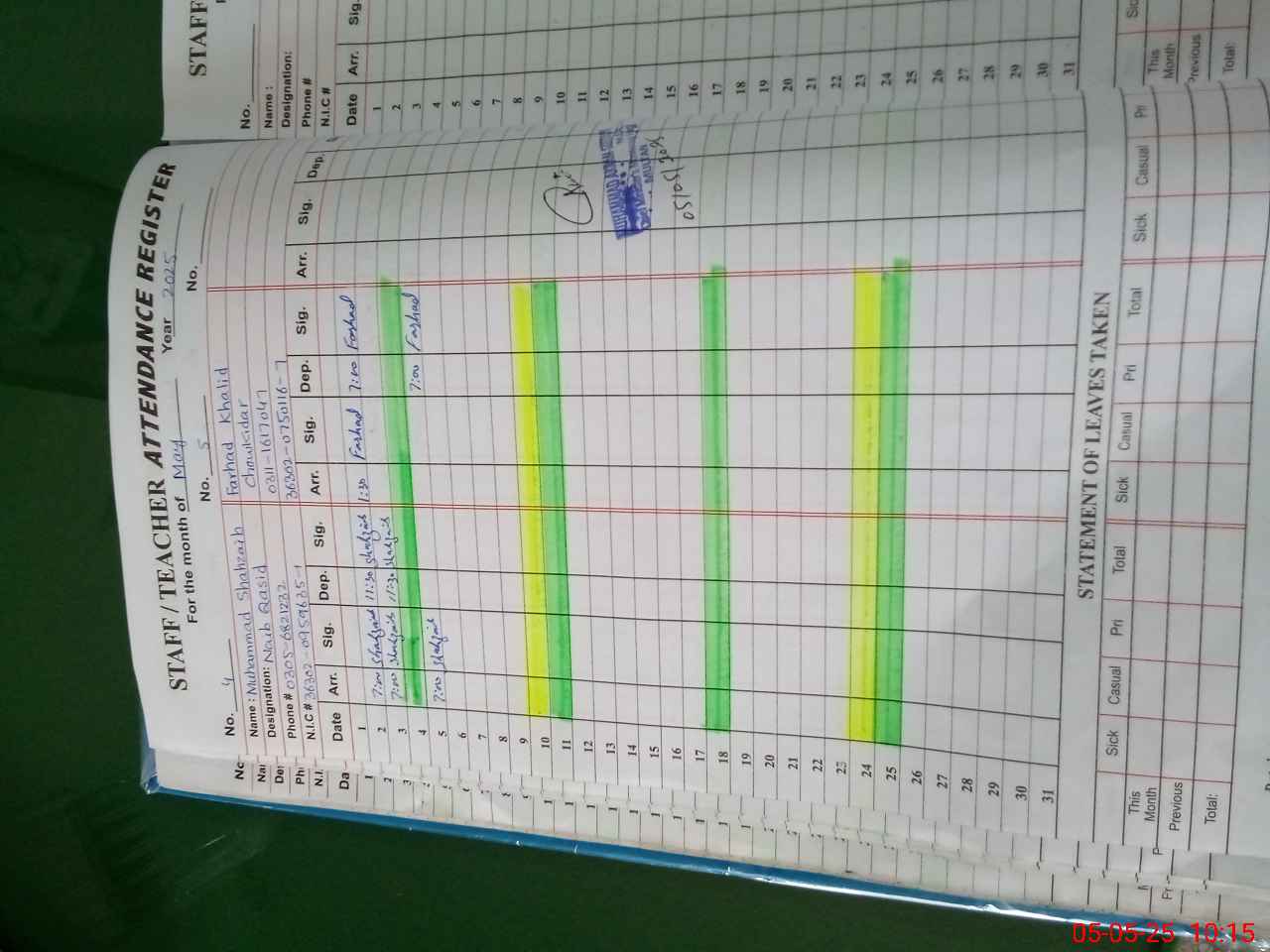 | CNIC | Full Name | Designation | R/C | Absence During Last Calender Month |