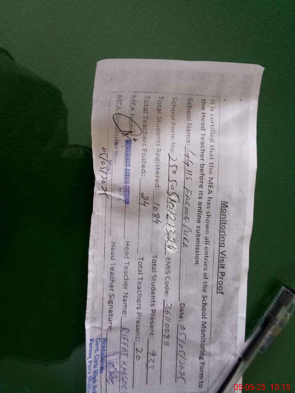 | Certified that this School was Inspected by the Undersigned MEA/DMO Today and the Information Stated Above is as Per Record. | |||||