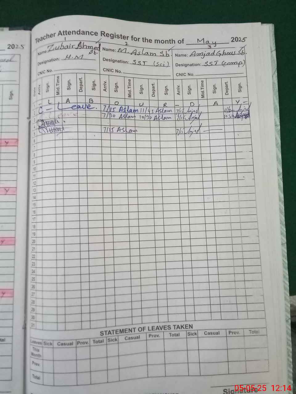| CNIC | Full Name | Designation | R/C | Absence during last cal. month |