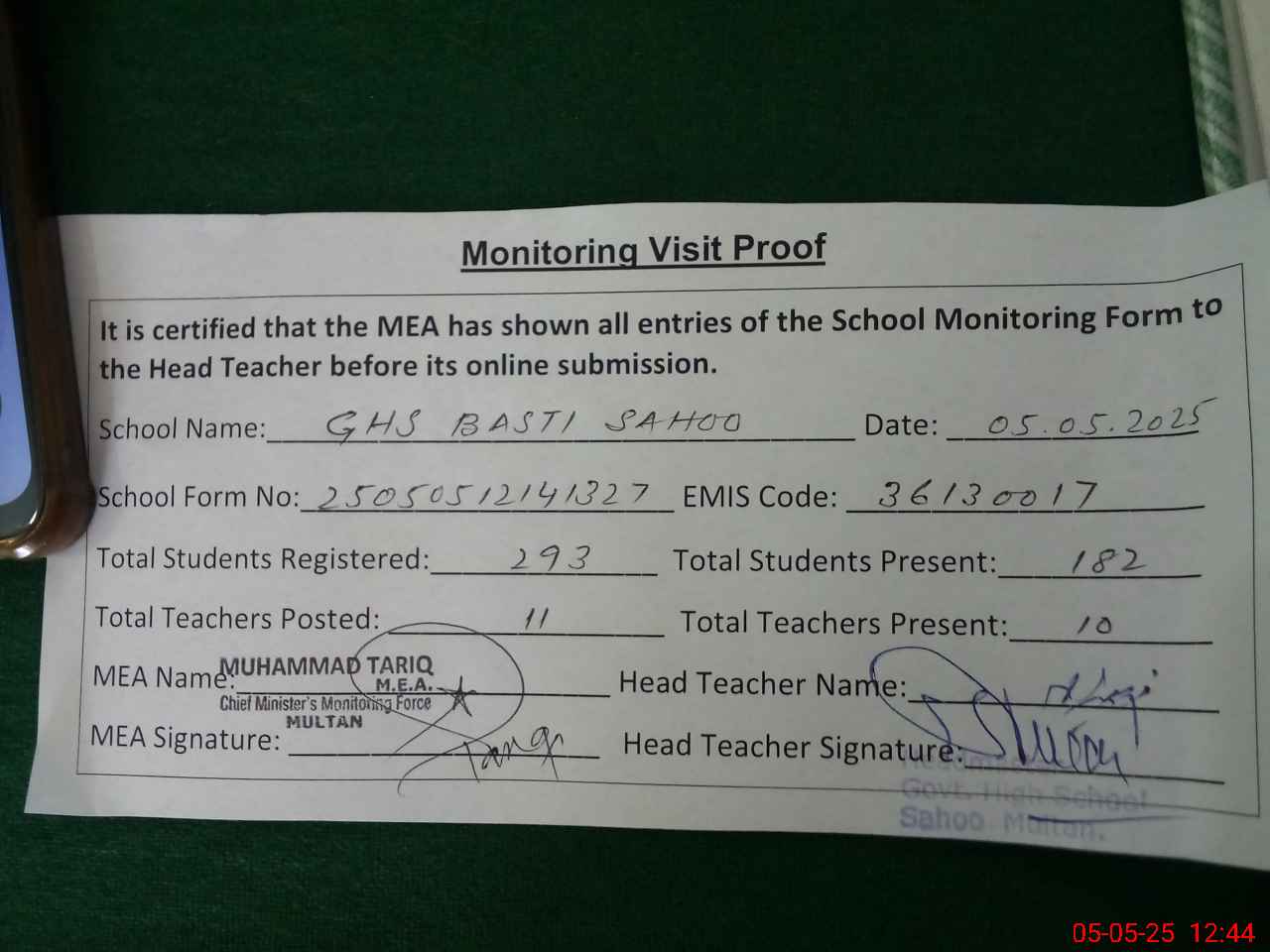 | Attendance Register | Head Teacher | MEA with School | Visit Proof |