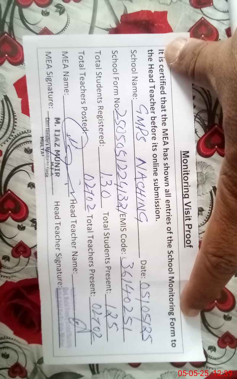 | Certified that this School was Inspected by the Undersigned MEA/DMO Today and the Information Stated Above is as Per Record. | |||||