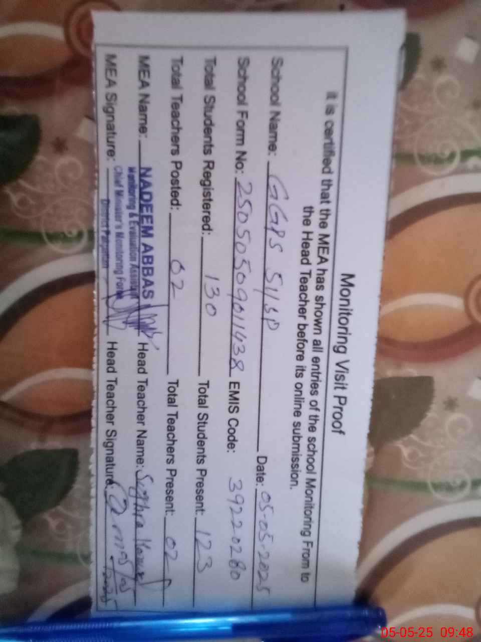 | Attendance Register | Head Teacher | MEA with School | Visit Proof |