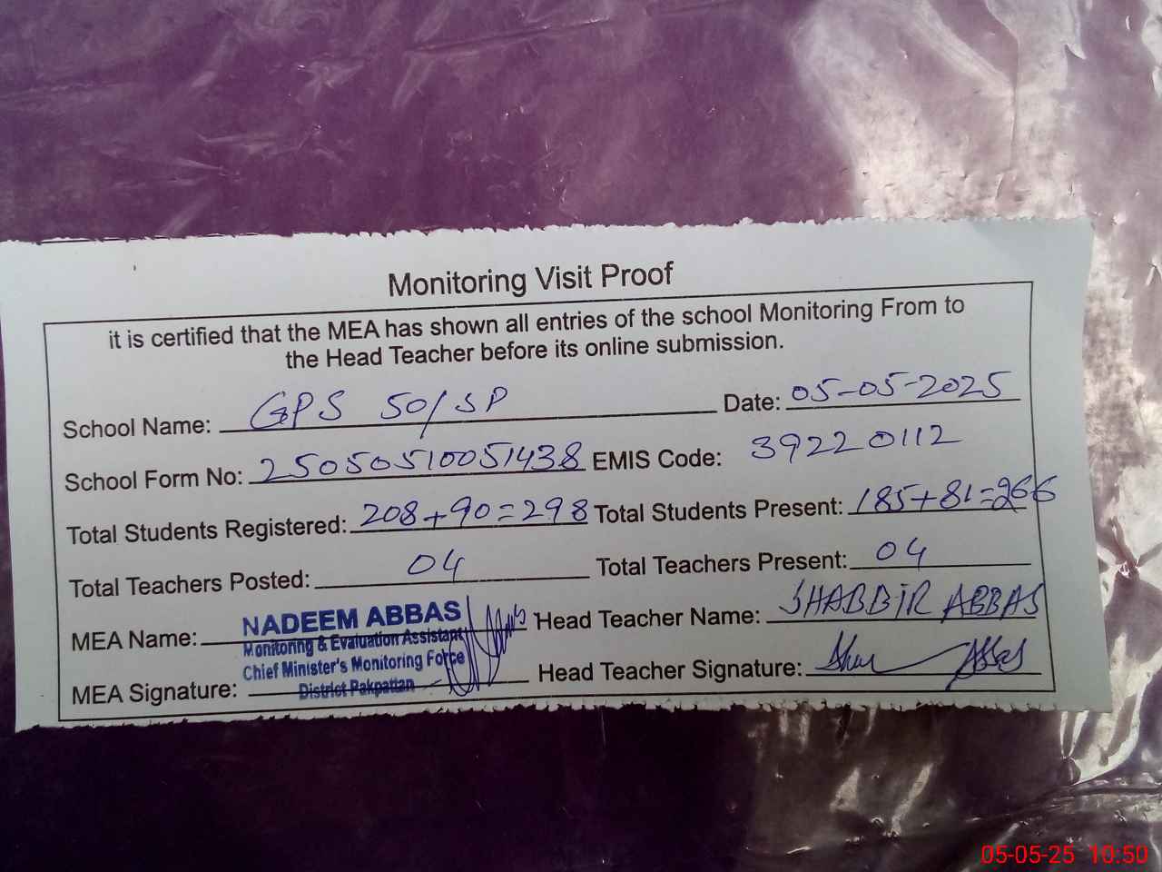 | EMIS Code: 39220112 | Name of School: GPS 50 SP | |||