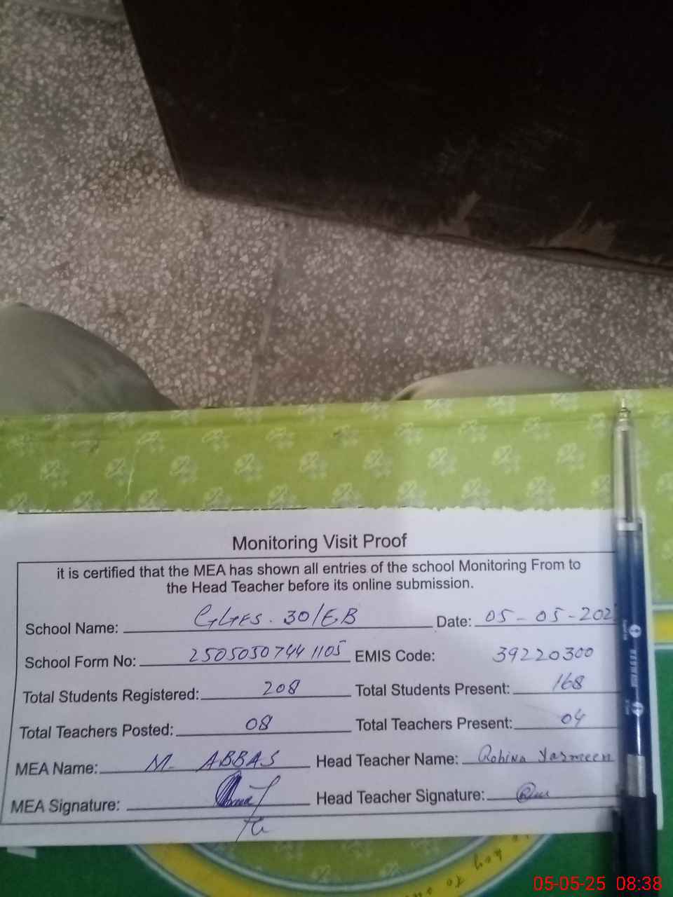 | Attendance Register | Head Teacher | MEA with School | Visit Proof |