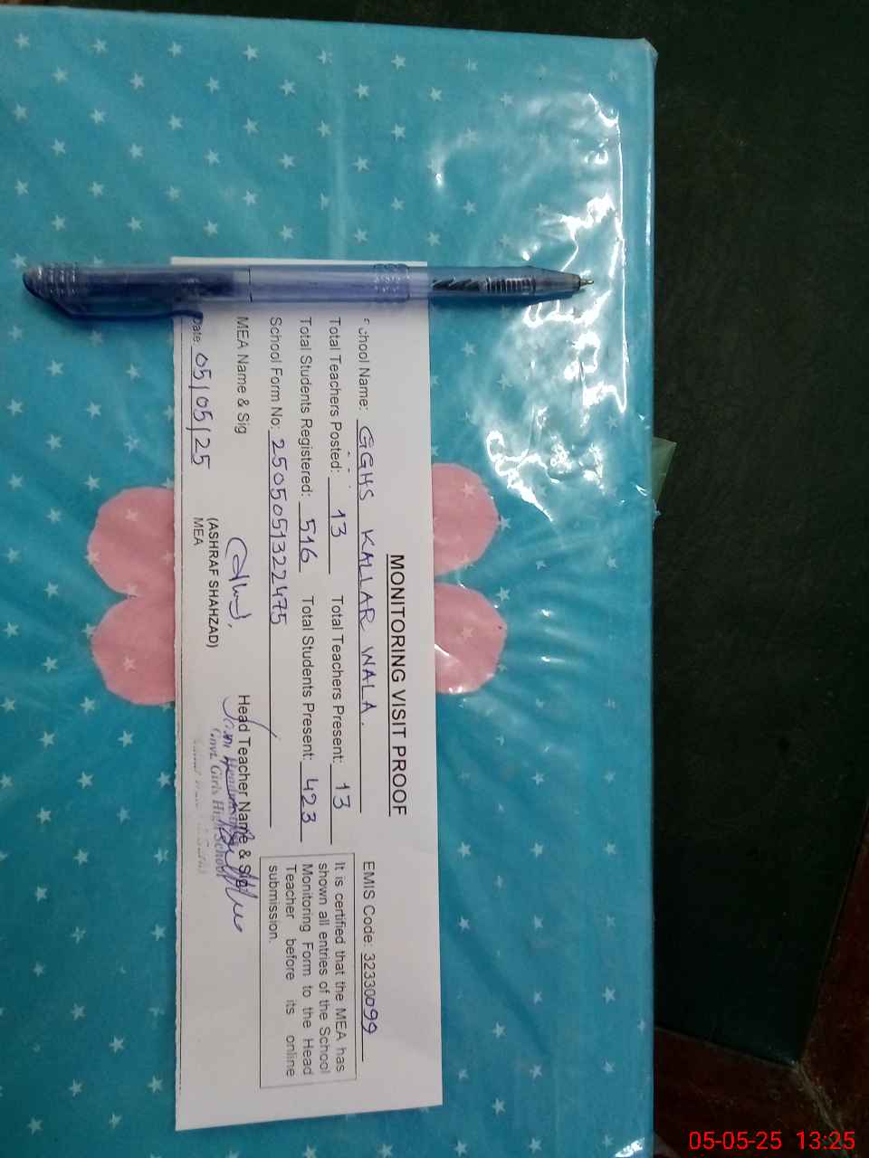 | Attendance Register | Head Teacher | MEA with School | Visit Proof |