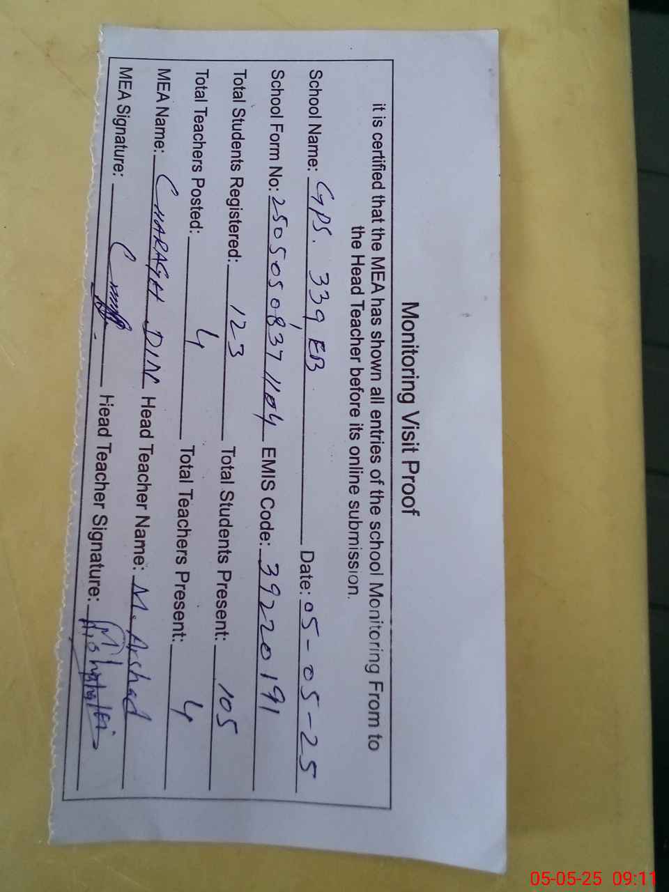 | Attendance Register | Head Teacher | MEA with School | Visit Proof |