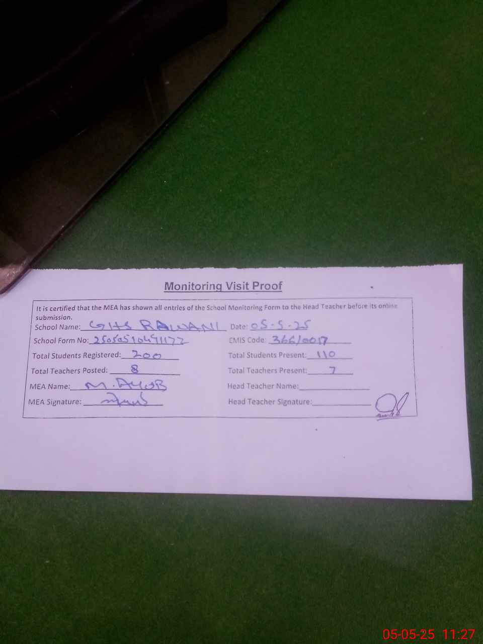 | Attendance Register | Head Teacher | MEA with School | Visit Proof |