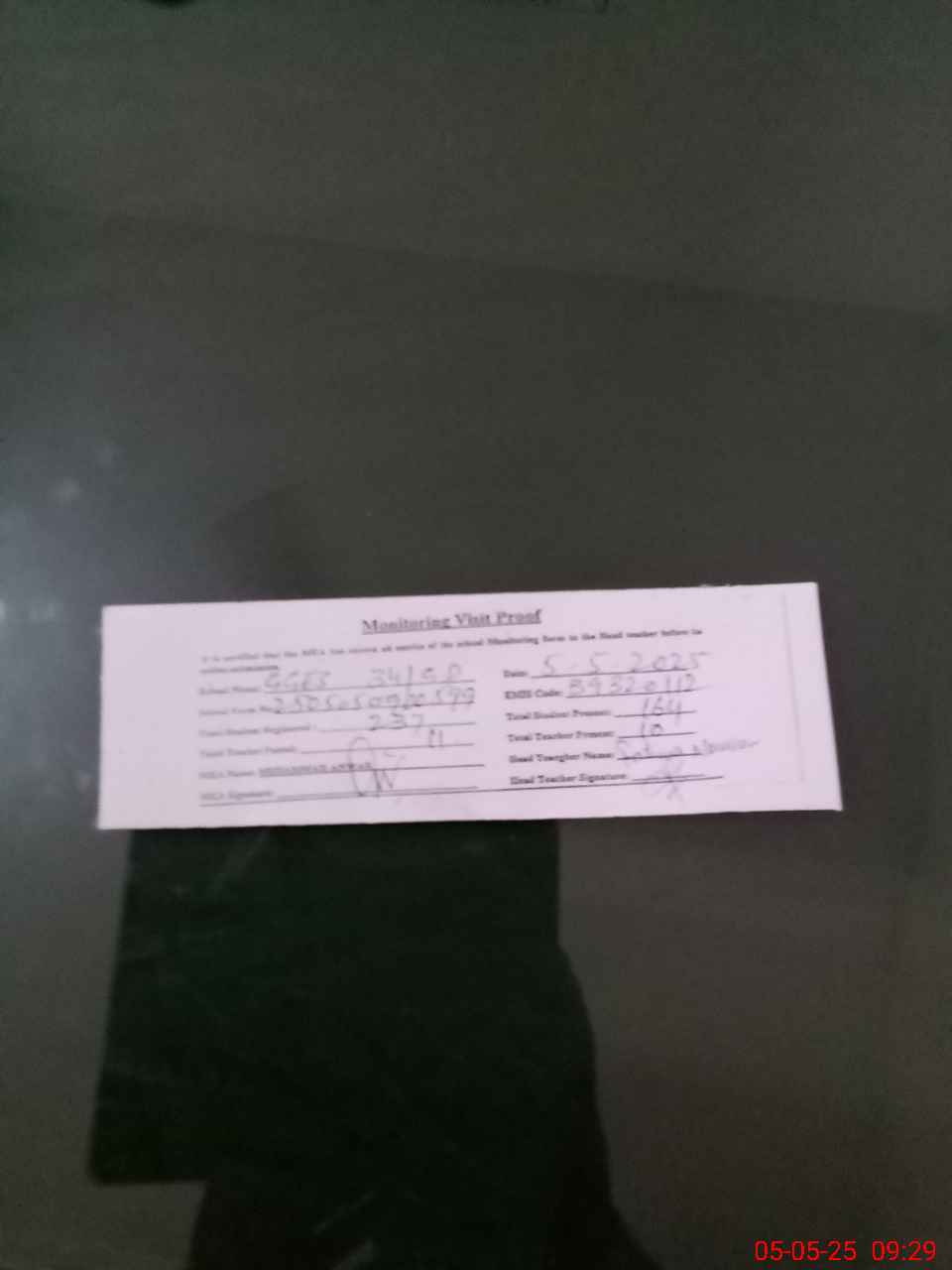 | Attendance Register | Head Teacher | MEA with School | Visit Proof |