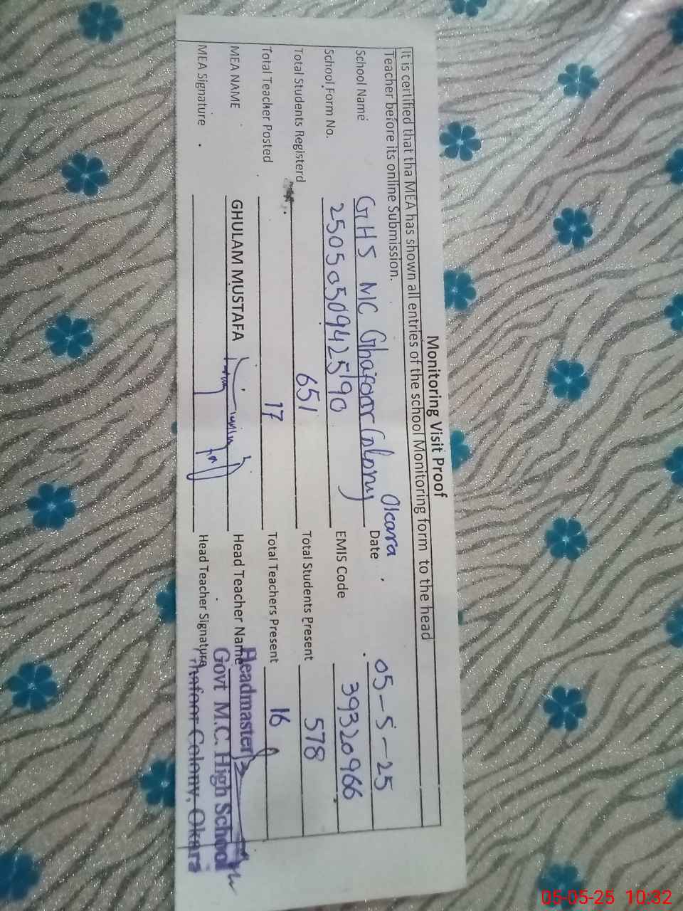 | EMIS Code: 39320966 | Name of School: GHS MC GHAFOOR COLONY OKARA | |||