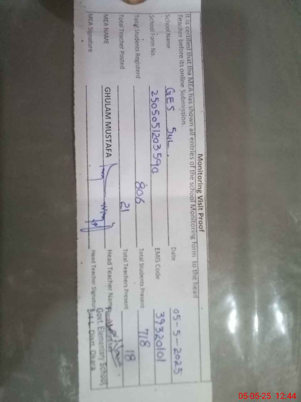 | Attendance Register | Head Teacher | MEA with School | Visit Proof |