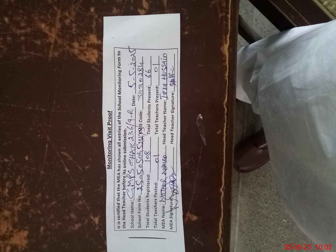 | Attendance Register | Head Teacher | MEA with School | Visit Proof |