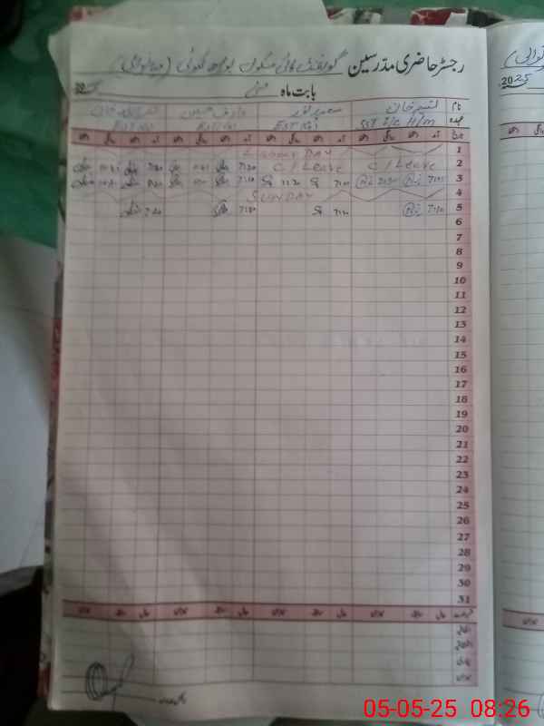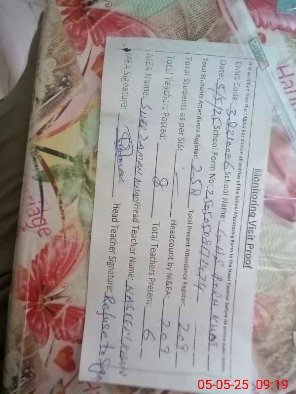 | Remarks (Use Separate Page if Required): EST Riaz Ahmad and EST Saeed Noor were un authorized they reached at 0817 hrs at school gate after MEA visit timing and marked bogus timing 0715 hrs on attendence register and there was no electricity and drinking water in the school and all toilets were non functional due to non availability of water and Head master refuse to sign the visit proof | |||||