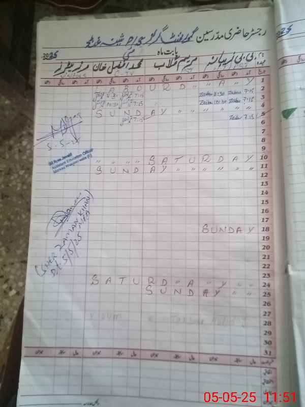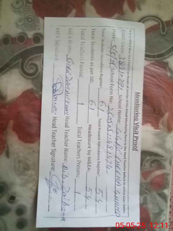 | Remarks (Use Separate Page if Required): PST MARIUM GHULAB was expired in road accident on 25 April 2025 and drinking water was not available in the school | |||||