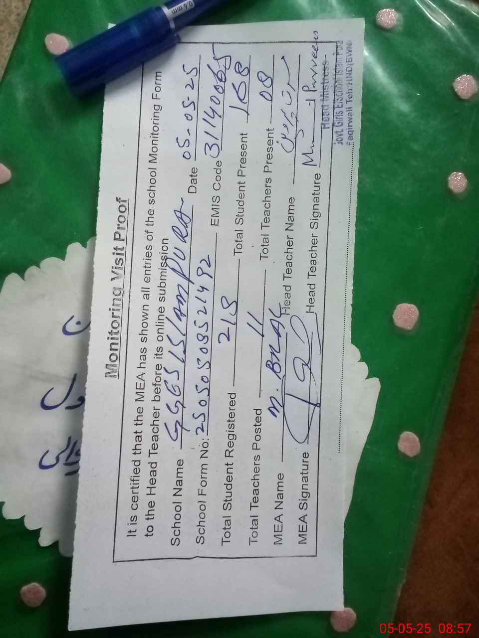 | Attendance Register | Head Teacher | MEA with School | Visit Proof |