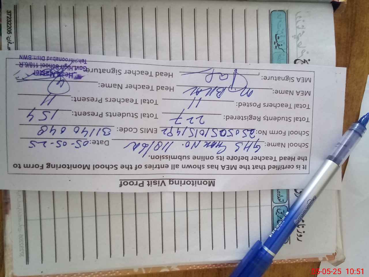 | Attendance Register | Head Teacher | MEA with School | Visit Proof |