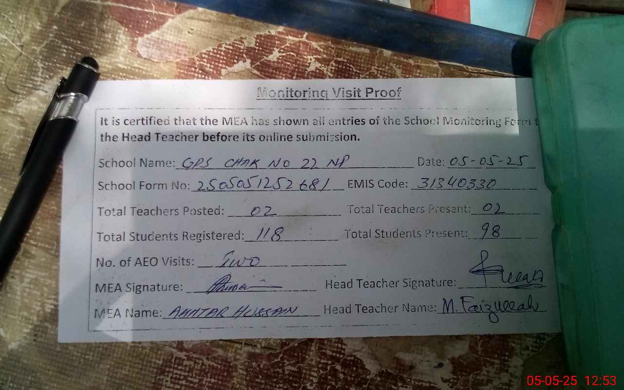 | EMIS Code: 31340330 | Name of School: GPS CHAK NO 22/NP | |||
