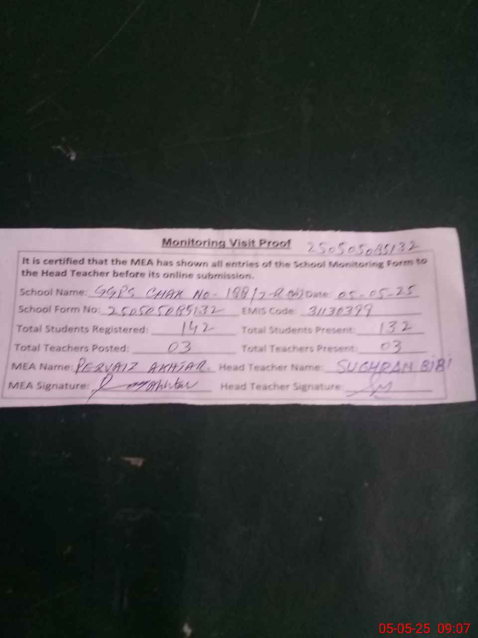 | Attendance Register | Head Teacher | MEA with School | Visit Proof |