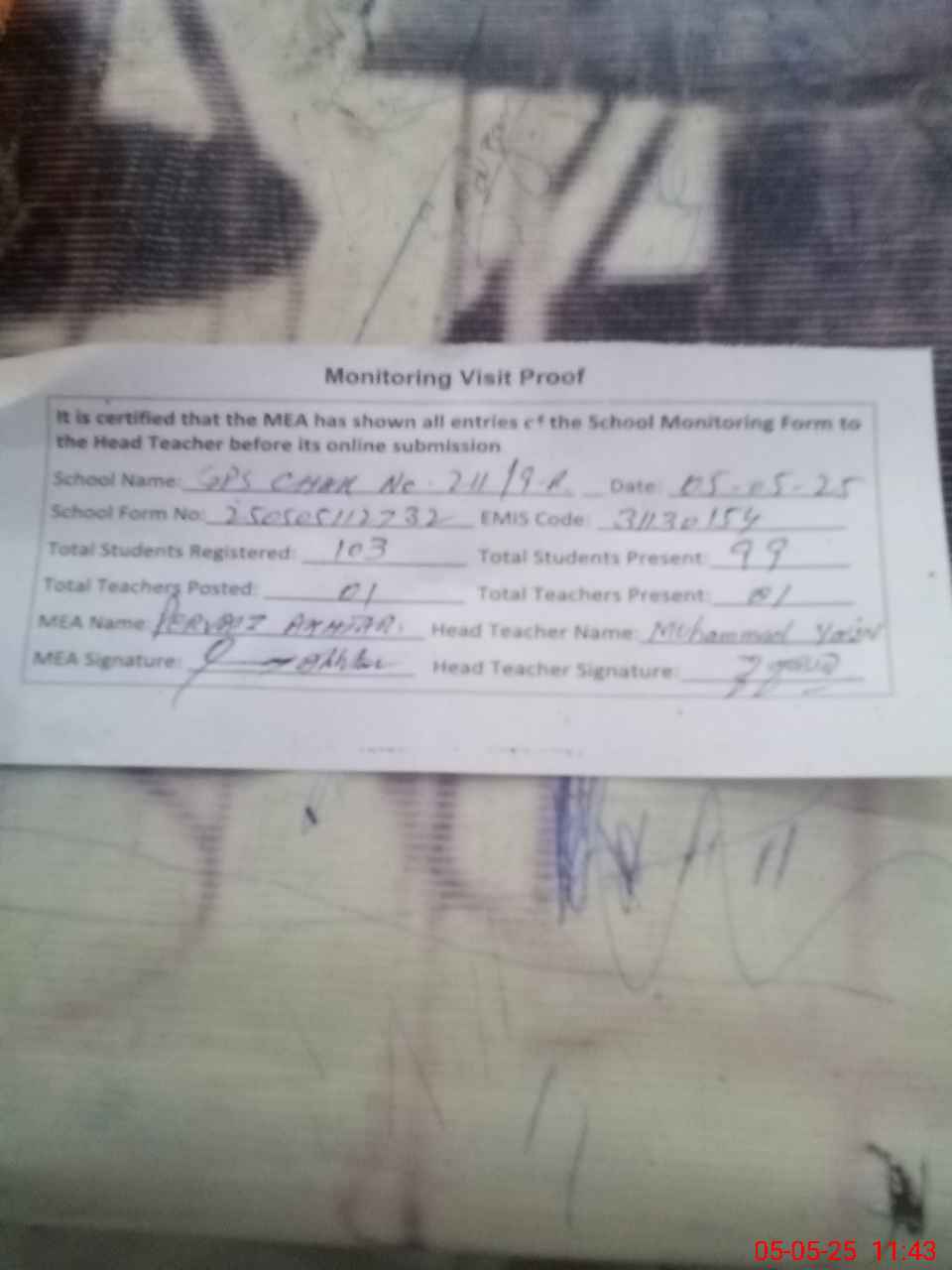 | Attendance Register | Head Teacher | MEA with School | Visit Proof |