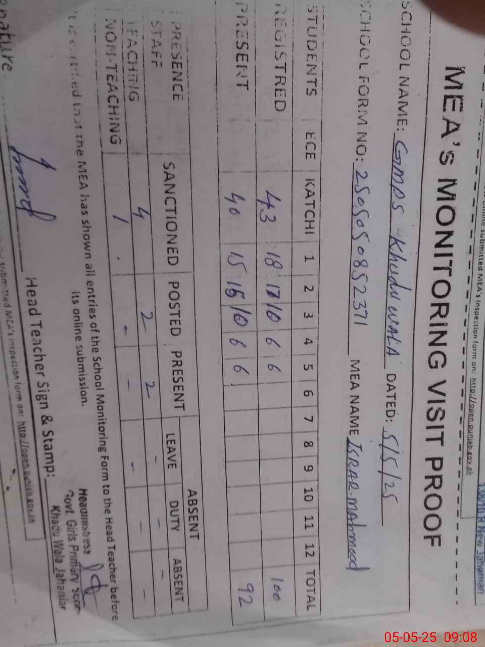 | Attendance Register | Head Teacher | MEA with School | Visit Proof |