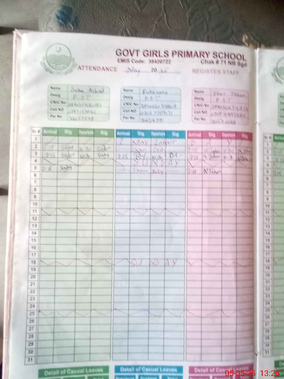 | CNIC | Full Name | Designation | R/C | Absence During Last Calender Month |