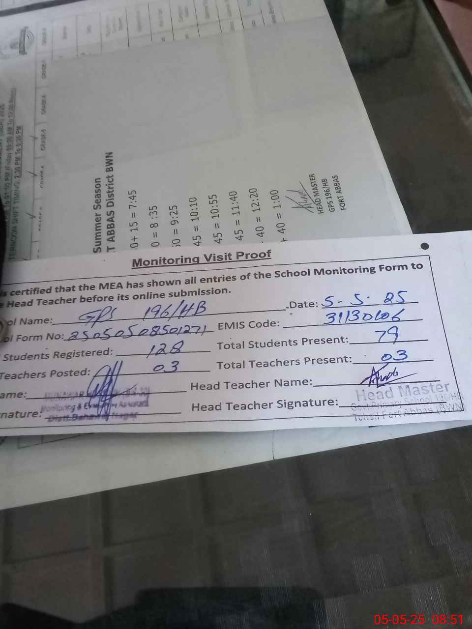 | Attendance Register | Head Teacher | MEA with School | Visit Proof |