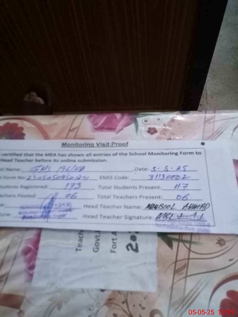 | Certified that this School was Inspected by the Undersigned MEA/DMO Today and the Information Stated Above is as Per Record. | |||||