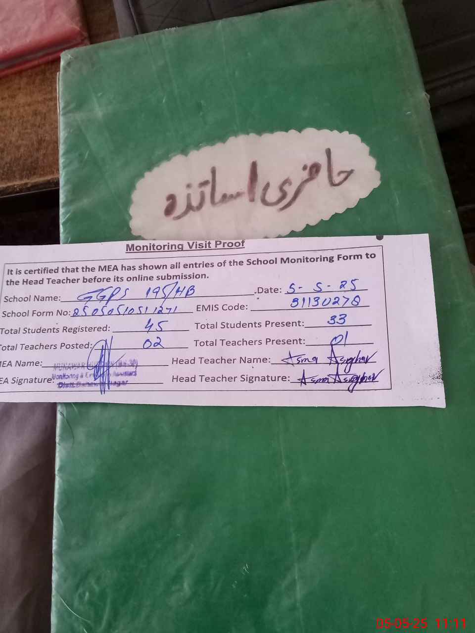 | Attendance Register | Head Teacher | MEA with School | Visit Proof |