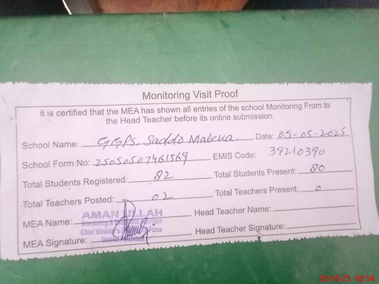 | Attendance Register | Head Teacher | MEA with School | Visit Proof |