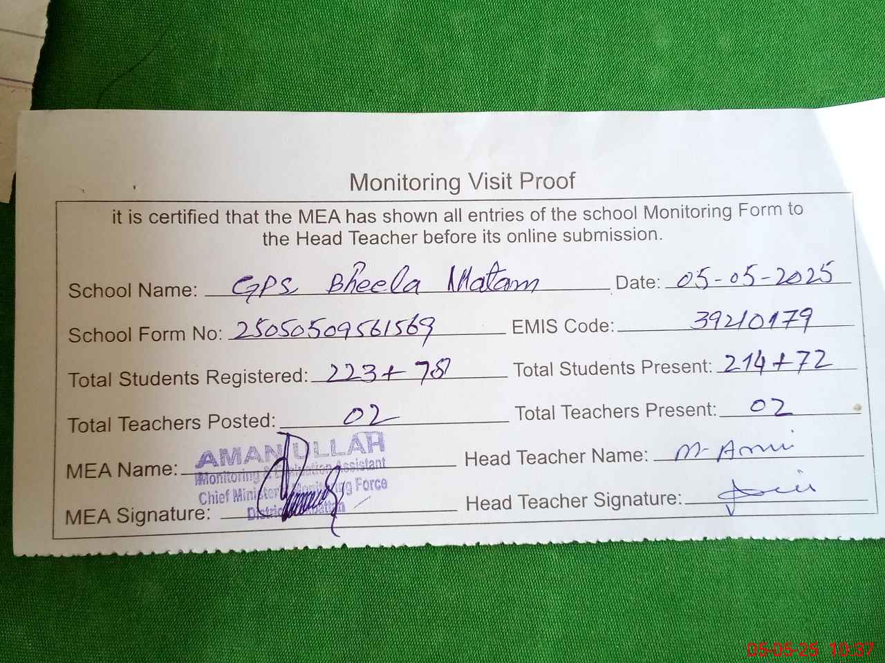 | Attendance Register | Head Teacher | MEA with School | Visit Proof |