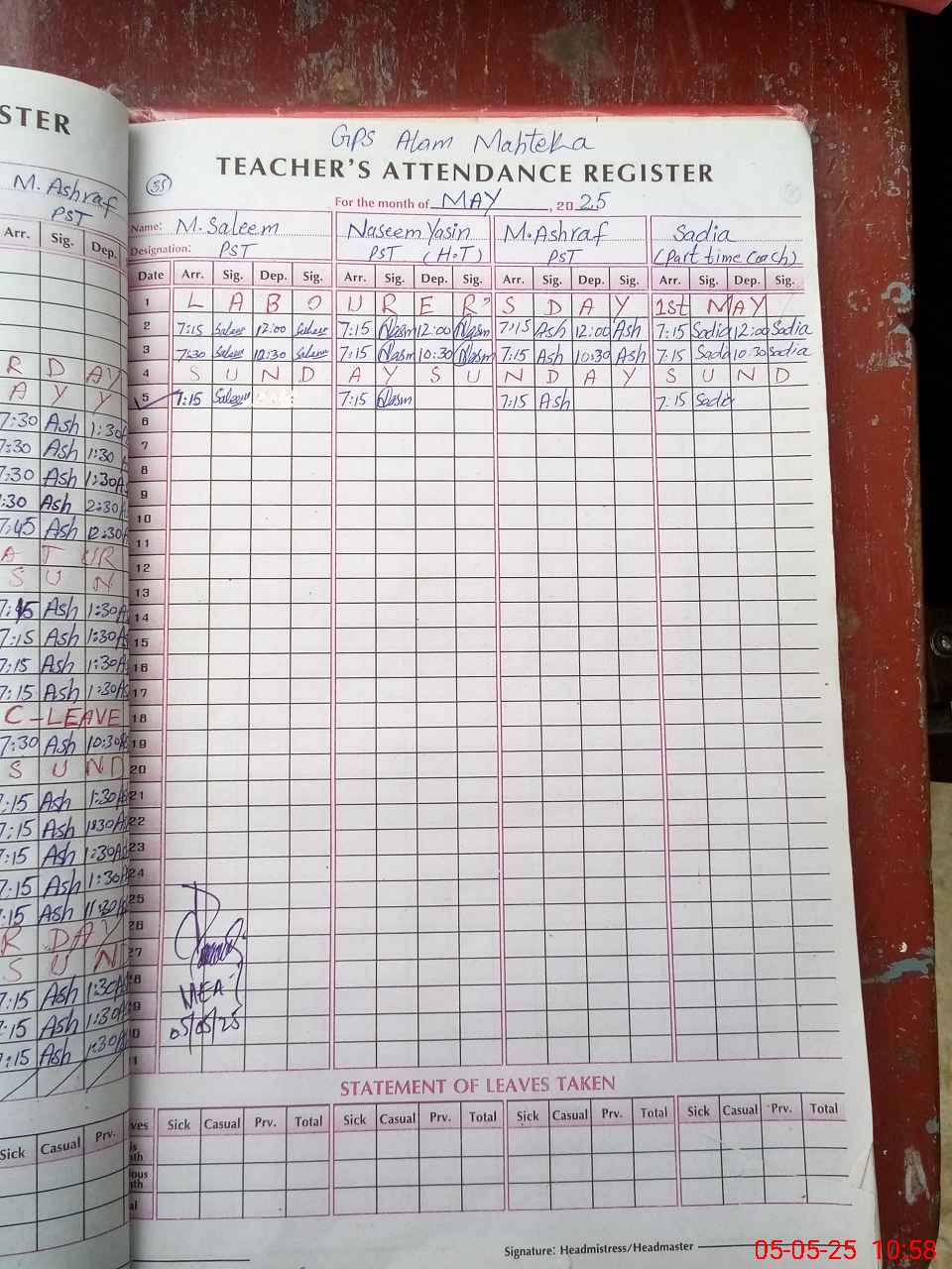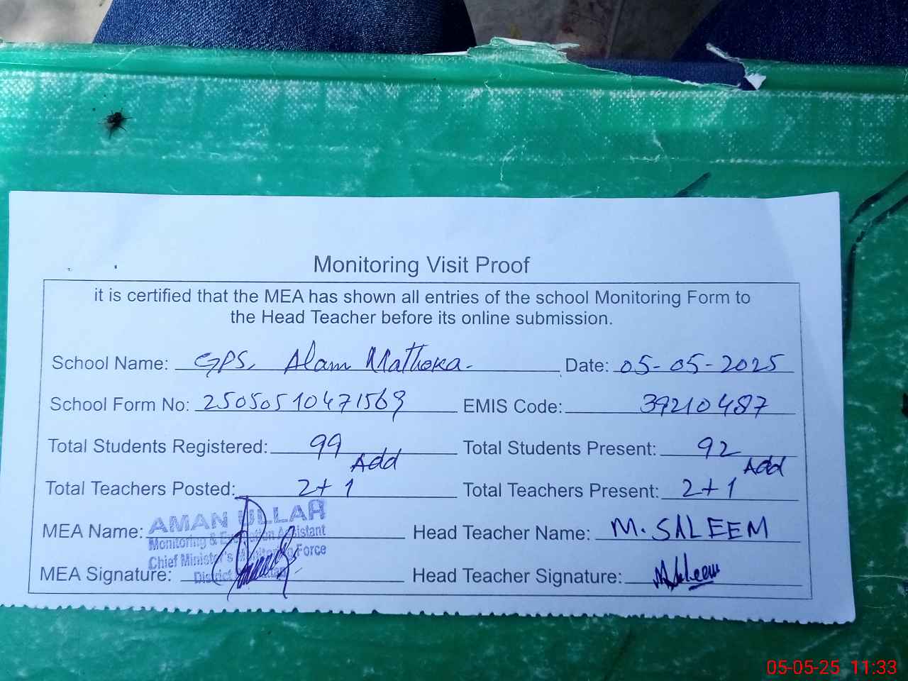 | Attendance Register | Head Teacher | MEA with School | Visit Proof |