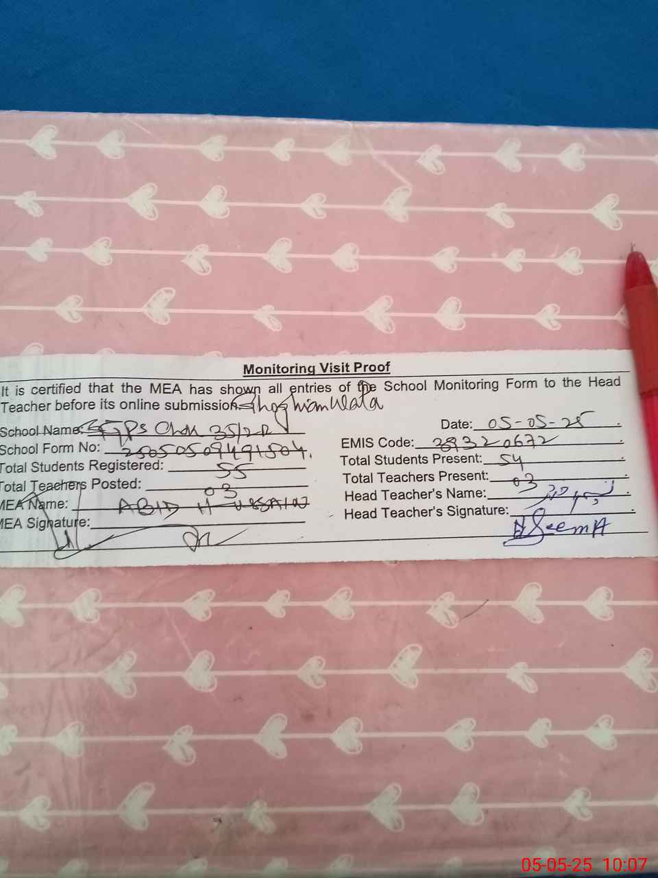 | Certified that this School was Inspected by the Undersigned MEA/DMO Today and the Information Stated Above is as Per Record. | |||||