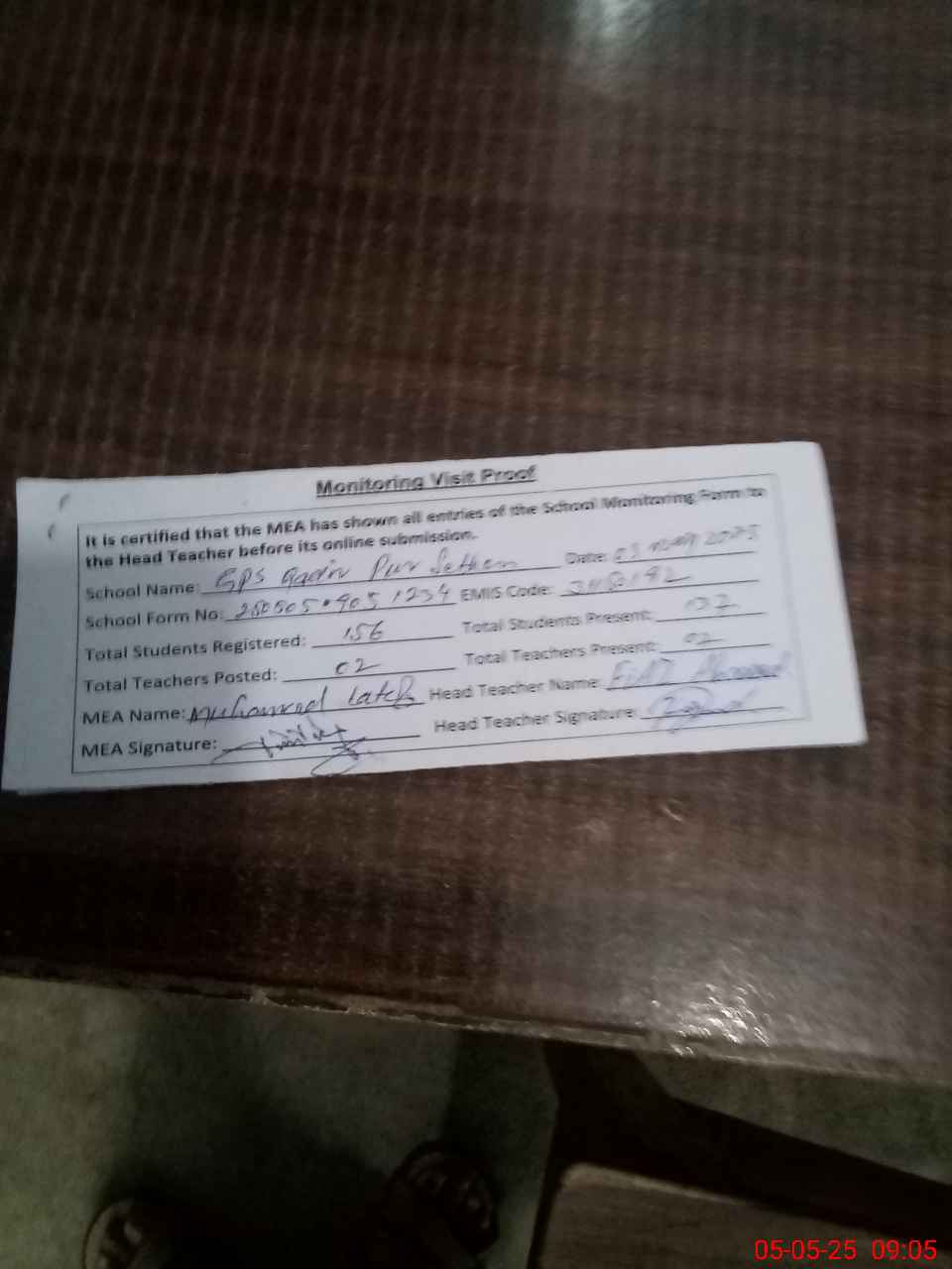 | Attendance Register | Head Teacher | MEA with School | Visit Proof |