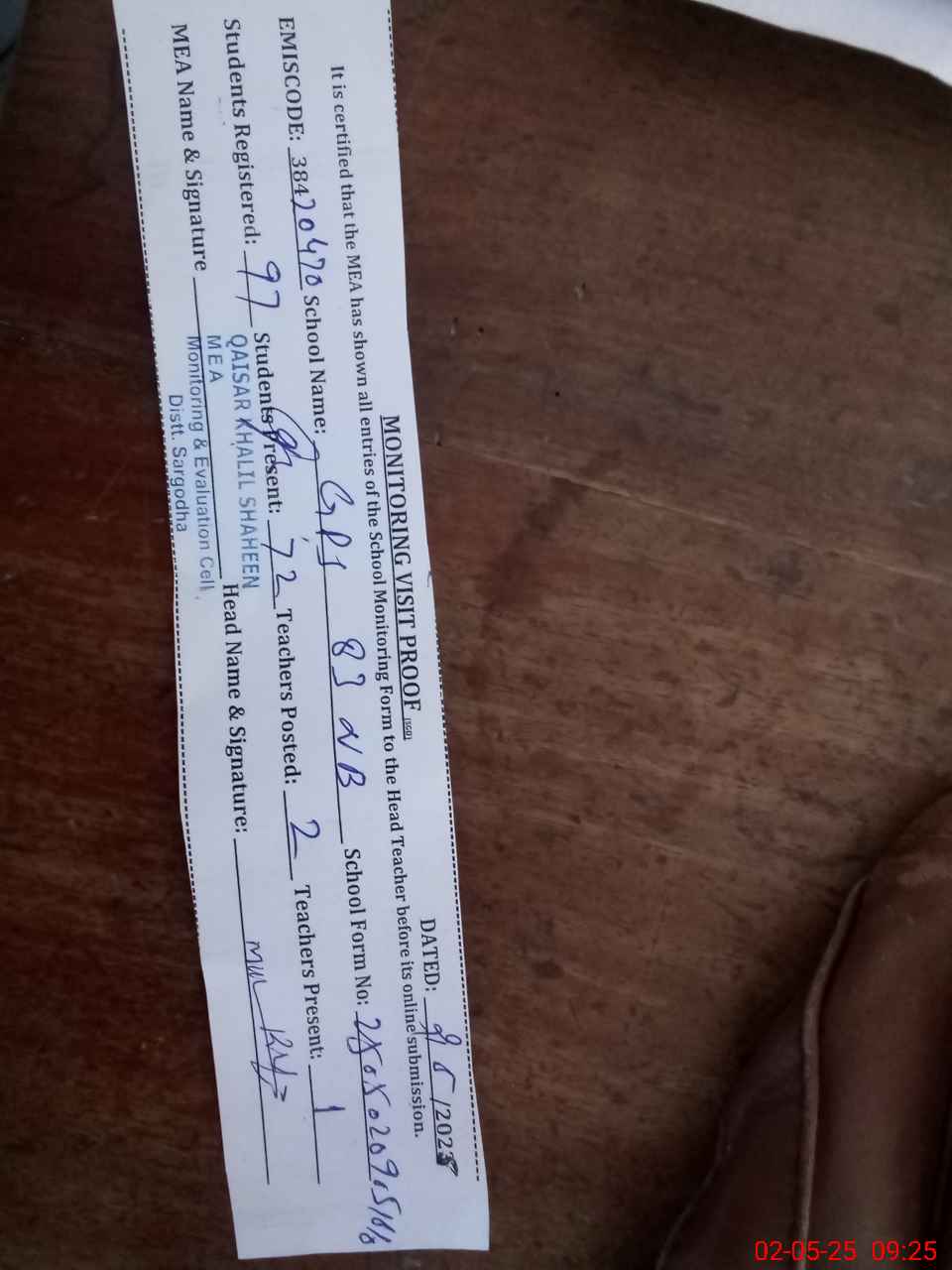 | Attendance Register | Head Teacher | MEA with School | Visit Proof |
