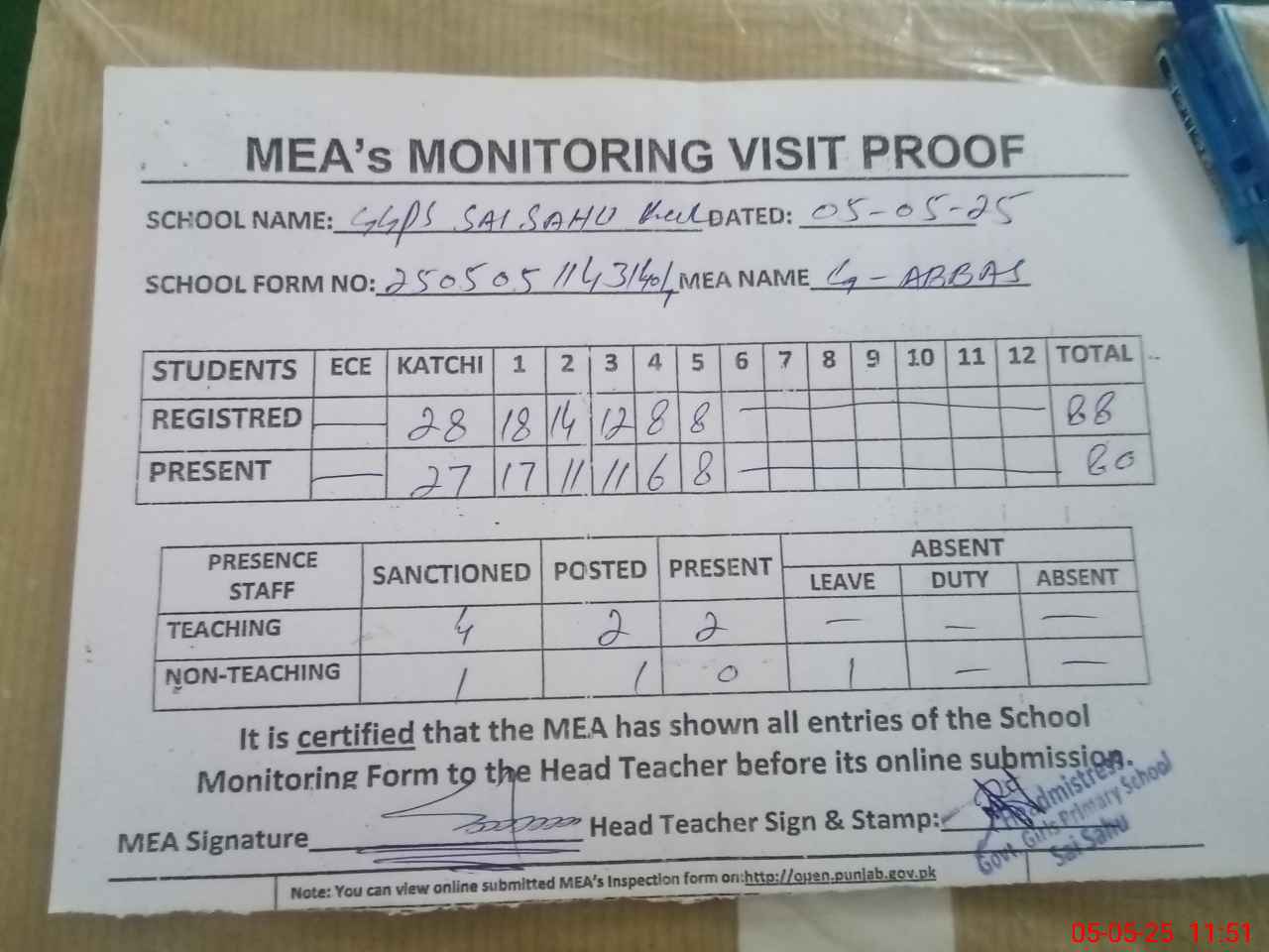 | Attendance Register | Head Teacher | MEA with School | Visit Proof |