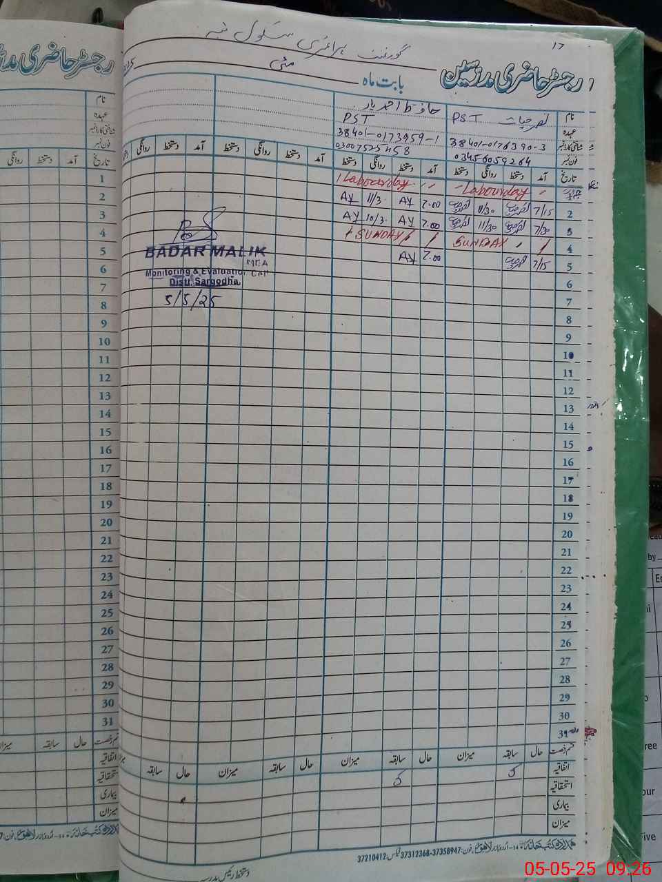 | District: SARGODHA | Tehsil: BHERA | Markaz: CHAK MUBARAK - MALE | Level: Primary | |