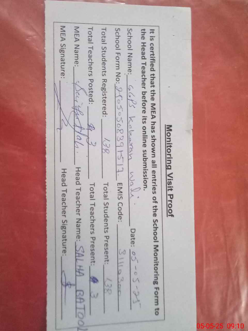 | Attendance Register | Head Teacher | MEA with School | Visit Proof |