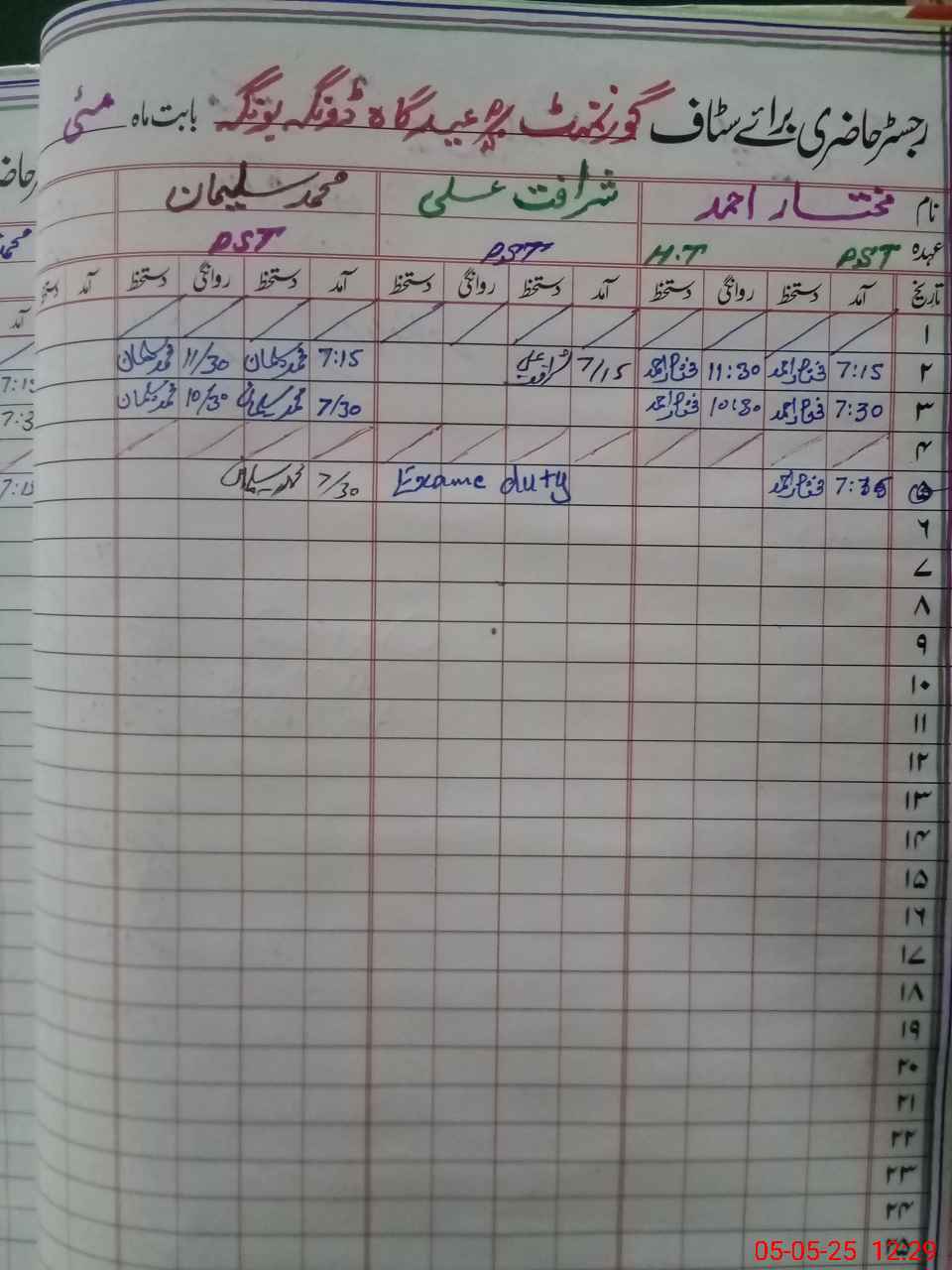 | 31**** | Sh**** Al**** | 1 | 1 | 0 | 0 | 0 | 0 | 0 | 0 | 0 | 0 | 0 | Exam Duty |