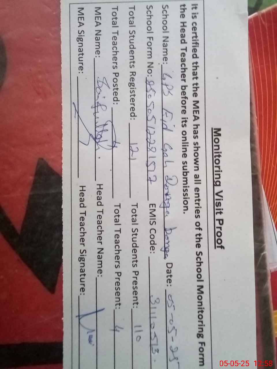 | Attendance Register | Head Teacher | MEA with School | Visit Proof |
