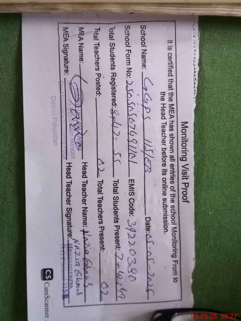 | Attendance Register | Head Teacher | MEA with School | Visit Proof |