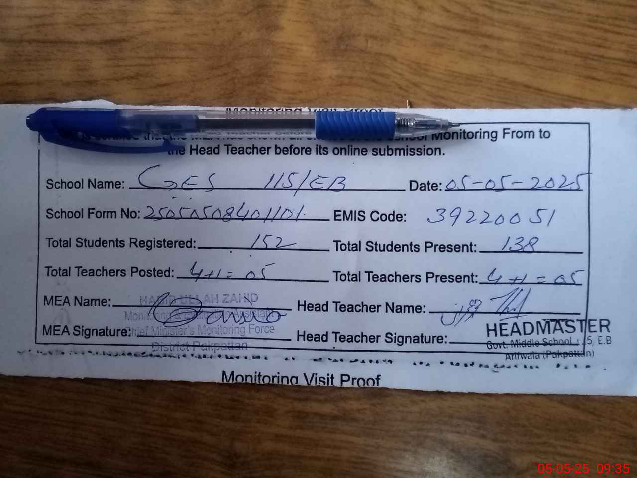 | Remarks (Use Separate Page if Required): Note STI AMIR HAMZA ASHIQUE EST CNIC 3640146517241 FOUND PRESENT AT THE TIME OF SCHOOL INSPECTION | |||||
